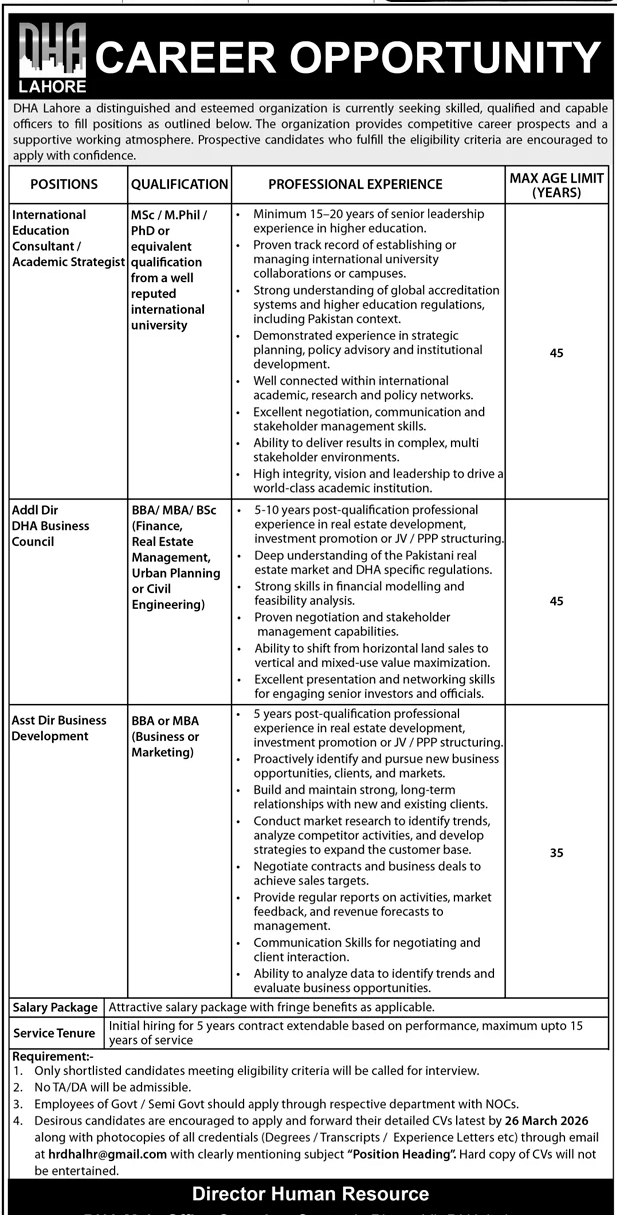 Interested candidates should forward detailed CVs along with photocopies of all credentials (degrees, transcripts, experience letters) via email to hrdhalhr@gmail.com with the subject clearly mentioning the position heading by 26 March 2026. Hard copies of CVs will not be entertained.Important Notes