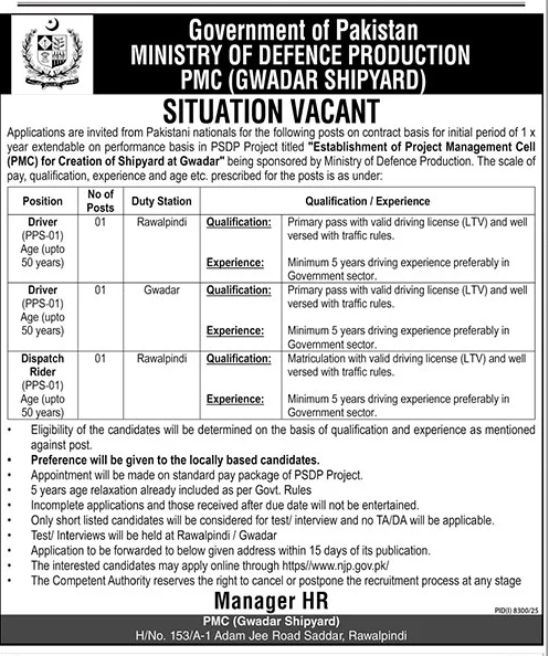 Applications are invited for Driver and Dispatch Rider positions on a contract basis for the Project Management Cell (PMC) for Creation of Shipyard at Gwadar, sponsored by the Ministry of Defence Production.