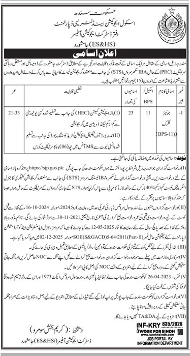 The School Education & Literacy Department, Government of Sindh, District Education Officer Mirpurkhas invites applications for Junior Instructor positions under the Sindh Technical Support Program (STS) for the year 2024.Vacancies