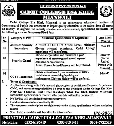 Cadet College Esa Khel, Mianwali, an autonomous educational institute under the Government of Punjab, seeks to recruit staff for security and technical roles to support college operations.Vacancies