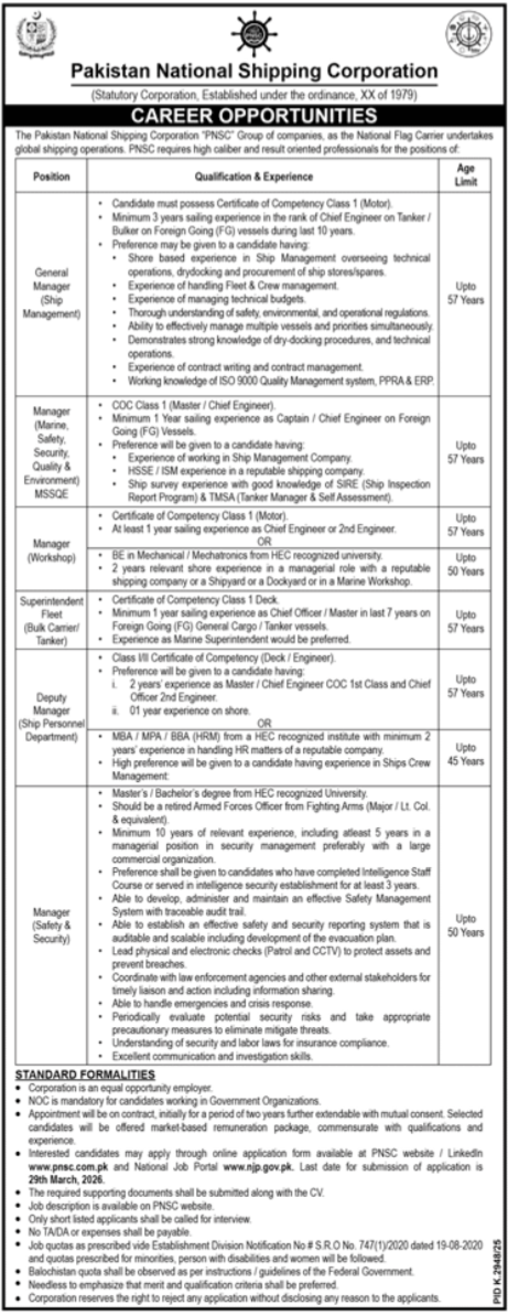 Pakistan National Shipping Corporation (PNSC), the National Flag Carrier, is seeking high caliber and result-oriented professionals for various managerial roles to support its global shipping operations.